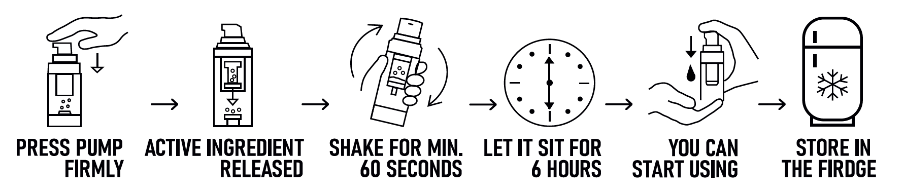 AKTIVÁLÁS: Az első használat előtt aktiváld a szérumot úgy, hogy erősen lenyomod a flakon pumpáját. Rázd fel alaposan legalább 60 másodpercig, majd hagyd állni minimum 6 órán át. Ezt követően a szérum használatra kész. A maximális hatékonyság és frissesség érdekében tárold hűtőszekrényben, és használd el 3 hónapon belül.